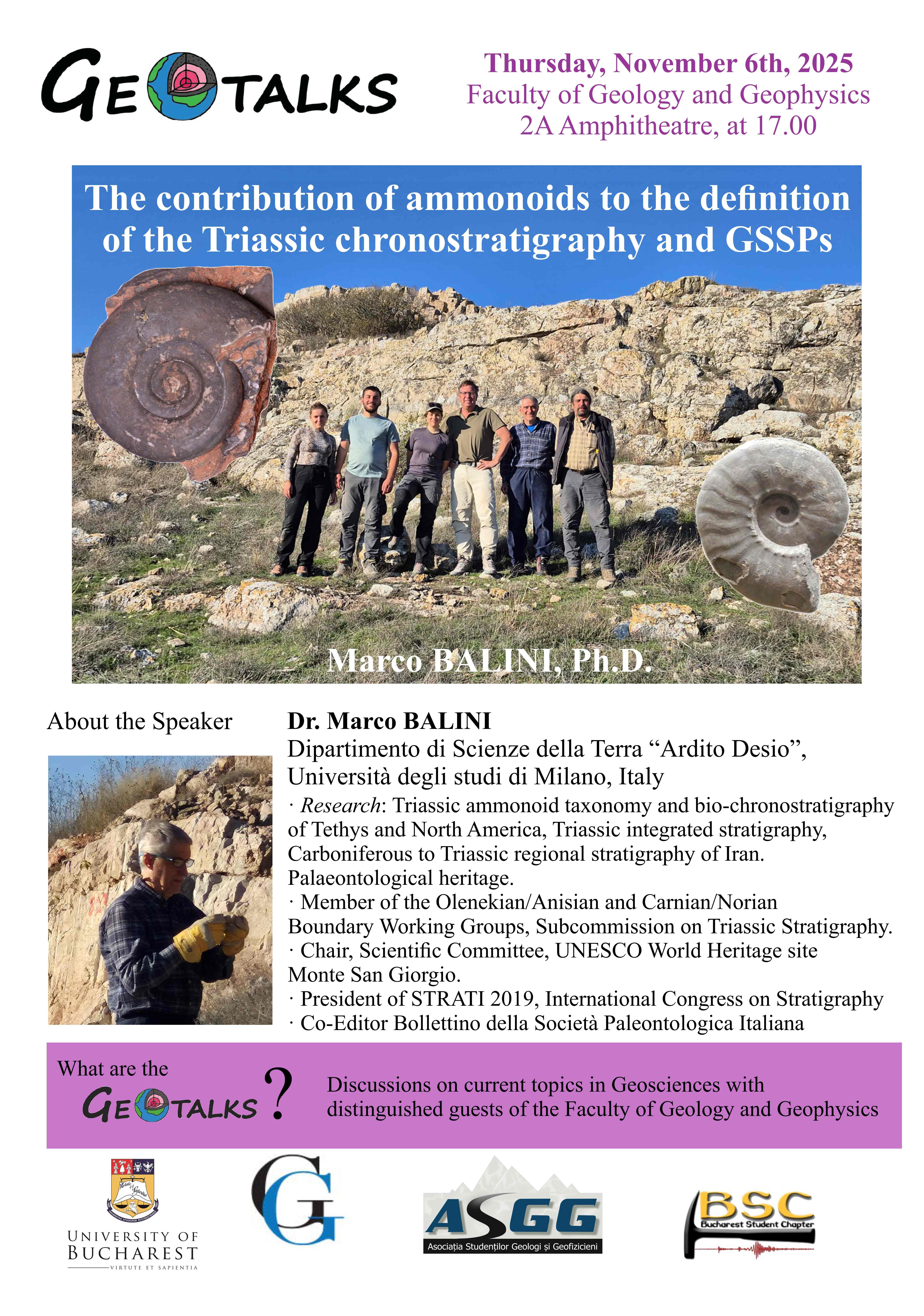 – by Prof. Dr. Marco BALINI from the Dipartimento di Scienze della Terra “Ardito Desio”, Università degli studi di Milano, Italy, on Thursday 6th November 2025, at 5 p.m., in the 2A Amphitheatre (2nd Floor) of the Faculty of Geology and Geophysics building at No.1 Nicolae Bălcescu Av., Bucharest.