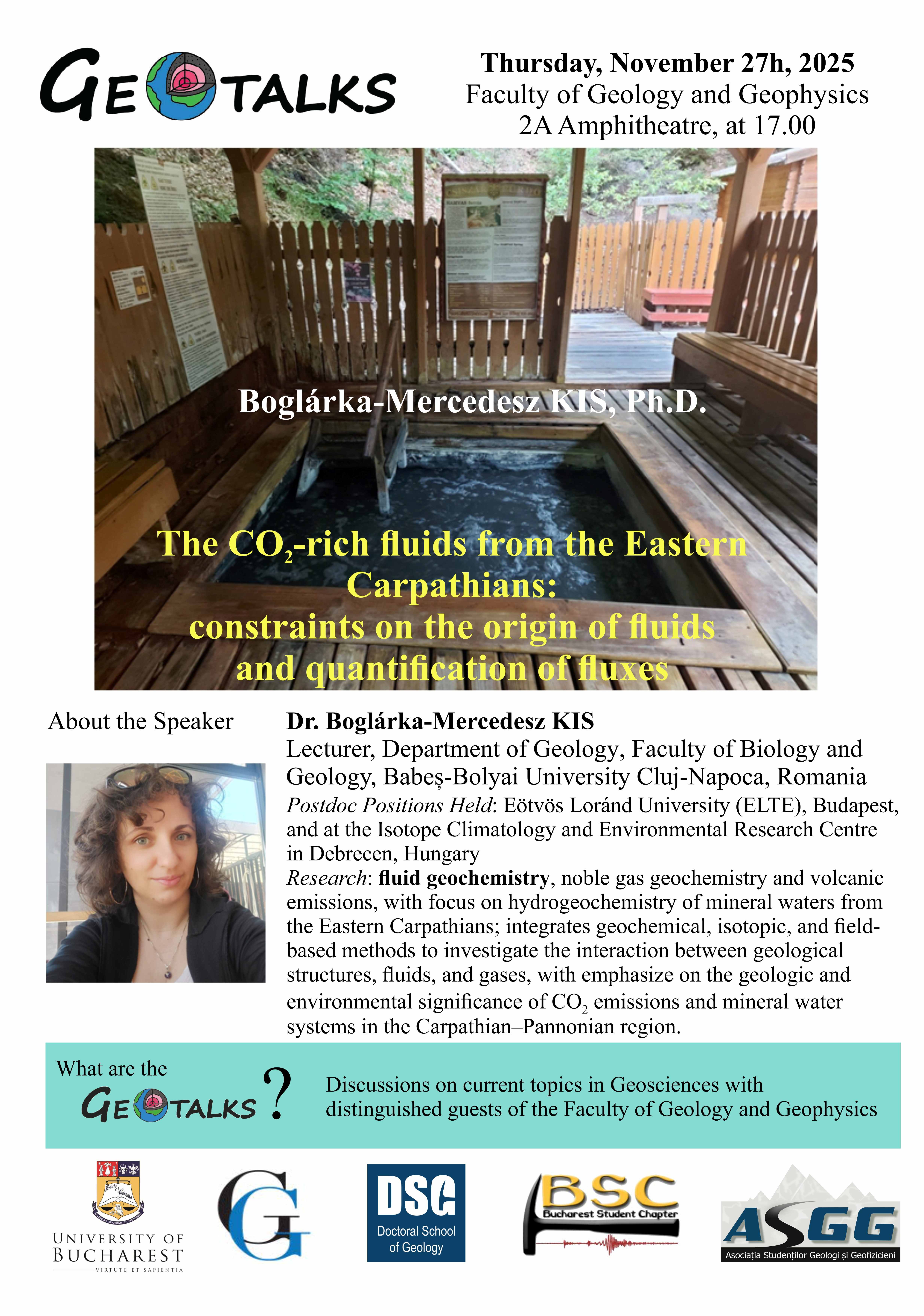 by Lect. Dr. Boglárka-Mercedesz KIS from the Department of Geology, Faculty of Biology and Geology, Babeș-Bolyai University Cluj-Napoca, on Thursday 27th November 2025, at 5 p.m., in the 2A Amphitheatre (2nd Floor) of the Faculty of Geology and Geophysics building at No.1 Nicolae Bălcescu Av., Bucharest. Please find attached the abstract and the announcement of the conference.
